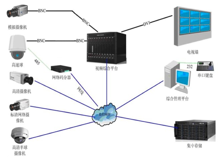 任何規模、任何形態、任何階段的視頻監控系統都可歸納為:由前端子系統、傳輸子系統、存儲子系統、顯示子系統和控制子系統組成。