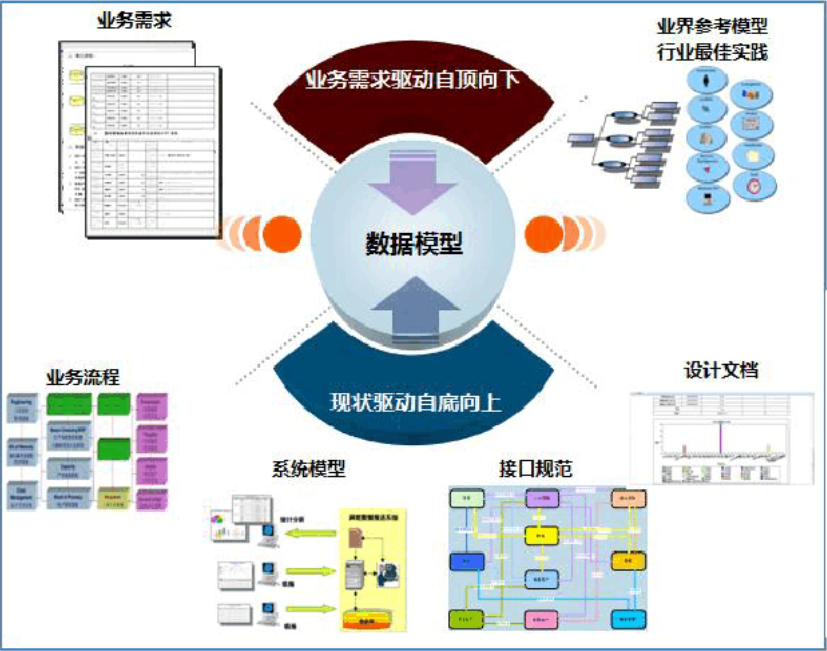 企業級數據模型設計可采用“業務需求驅動自頂向下”和“基于現狀驅動自底向上”相結合模式,參照業界參考模型、行業最佳實踐,共同形成數據模型。從業務需求驅動入手自頂向下,參照業界參考模型、行業最佳實踐搭建數據模型整體框架,通過現狀調研獲取企業內部業務流程、設計文檔、系統模型、接口規范等現狀信息,現狀驅動自底向上,細化和完善數據模型的設計。