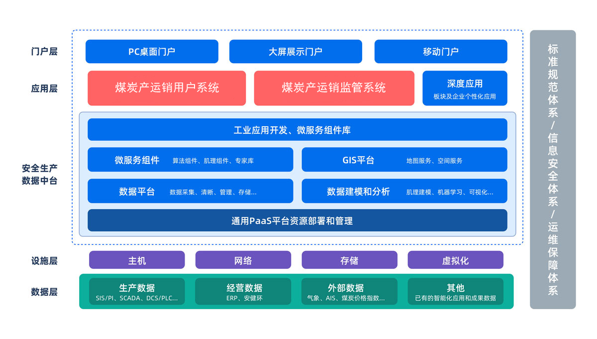 實現綜合看板、煤礦生產中心、煤炭承運中心、市煤銷售中心、綜合政務中心、運營支持中心等6大應用功能建設。