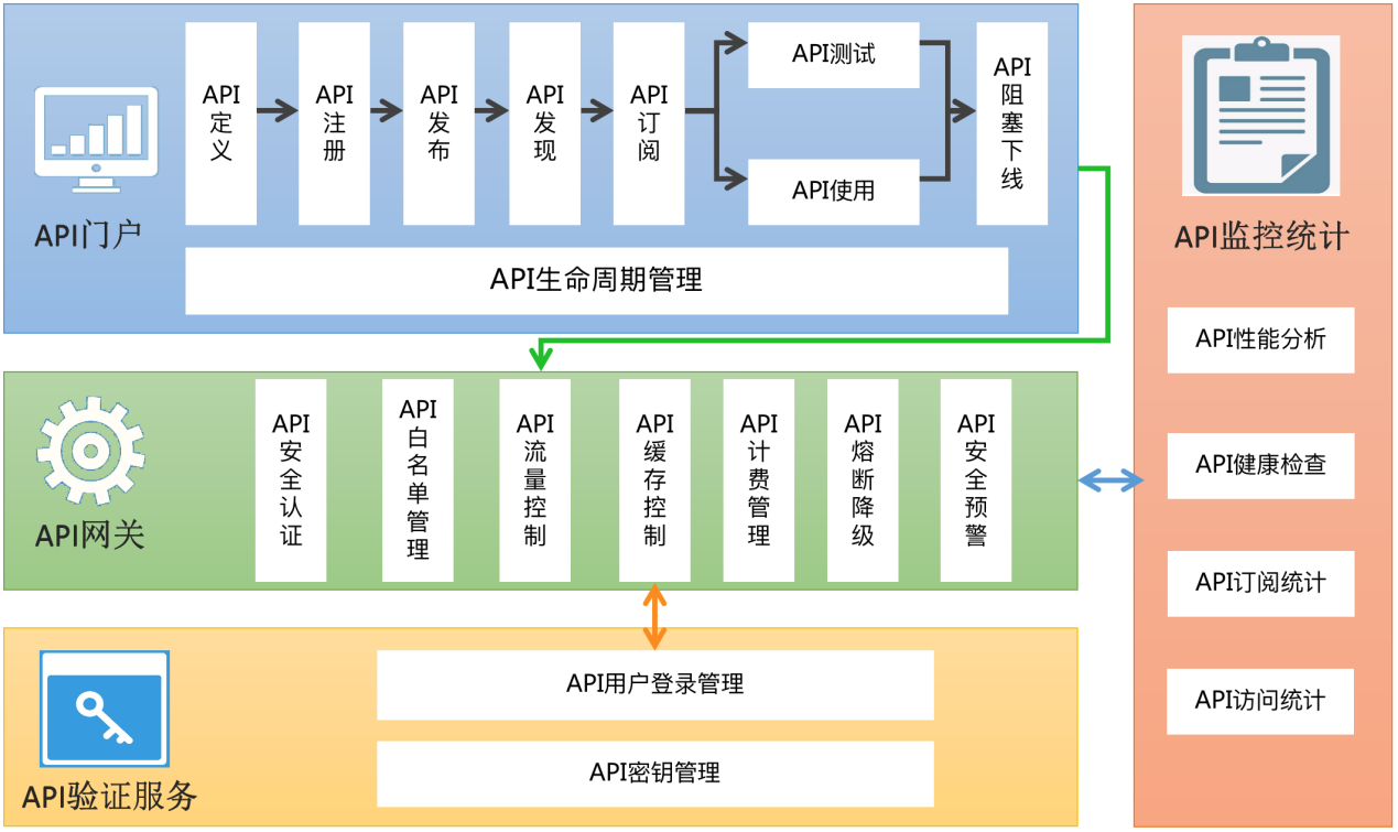 結合本項目需求和數據安全原則,規范微服務開發的業務流程,API門戶提供開放、阻塞、廢棄、銷毀等全生命周期管理功能;API網關提供整套安全防護手段,包括安全認證、流量控制、防惡意攻擊、API調用質量分析等功能,控制API的測試與使用;API驗證服務為框架提供API用戶登錄管理和密鑰管理支持;API監控通過API網關提供訂閱、統計功能。