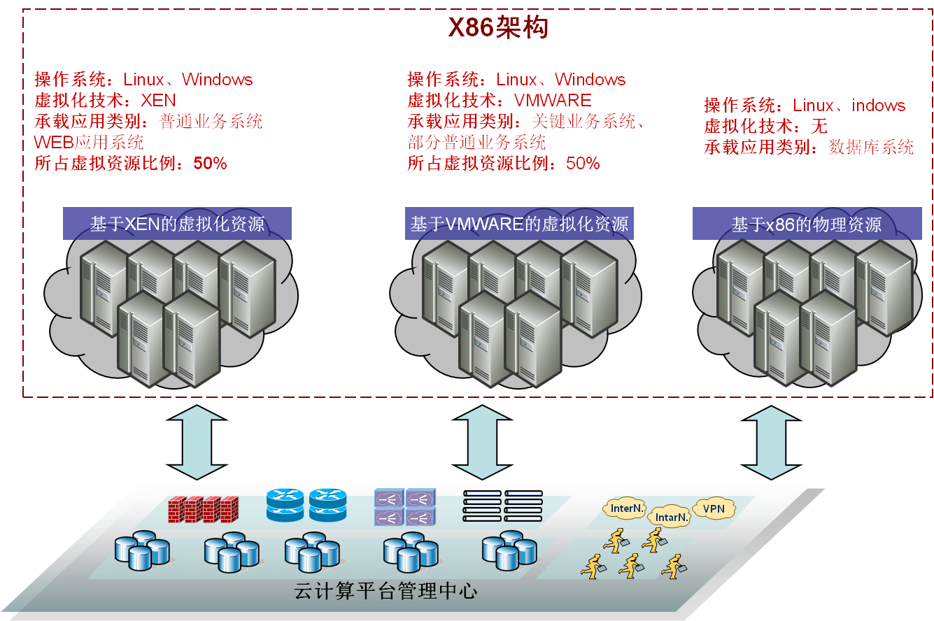 云基礎服務(IaaS):在充分利用既有投資的基礎上,利用云計算池化技術,建設計算池、存儲池、網絡池、容災池,根據應用情況隨需拓展,實現動態拓展、按需分配,資源共享。