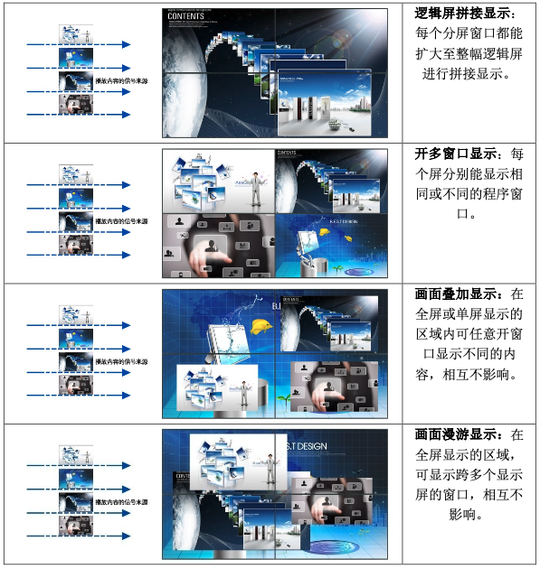 系統中任意信號可在拼接屏的任意位置開多個窗口,無公共區域的限制,可任意疊加、縮放、拉伸、畫中畫顯示,為用戶提供靈活的應用。