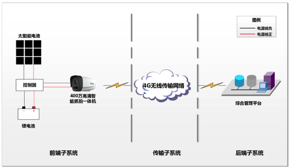 太陽能電子警察系統由前端子系統、傳輸子系統以及后端子系統組成,采用分層結構設計。通過4G無線傳輸網絡實現前端子系統與后端子系統之間的互聯互通。