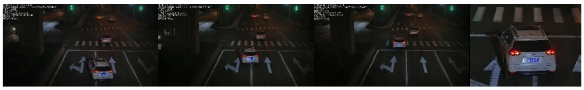 系統繼續跟蹤車輛行駛方向,當系統檢測到車輛不按車道指示箭頭方向行駛時,系統判定機動車不按車道行駛事件發生,發出控制指令拍攝第三張照片,照片能清晰辨別車輛全貌的全景特征、違法地點、違法時間、違法行為特征、號牌號碼、標志標線、行駛車道等信息。